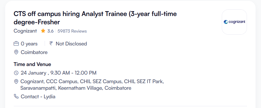 CTS off campus hiring Analyst Trainee stands out as a solid fresher opportunity with structured support, benefits, and career growth. If you meet the eligibility and are serious about starting in IT services, this walk-in could be your turning point. Prepare your documents and attend with confidence.